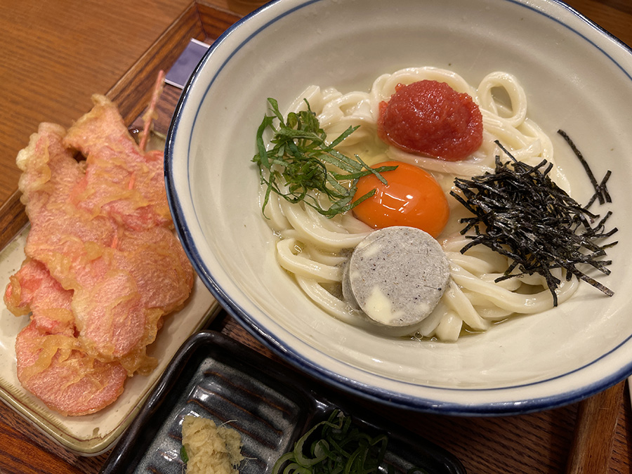 でね、この店、嬉しいことに立ち蕎麦とか丸亀系の天ぷらで私にとってKing of Tempraの紅生姜天がありまして、しかも形がそそるじゃありませんかぁ、写真見てみてくださいよぉ…合格です。うどんベストテン入り決定でございます。明太バター(いりこバター)釜玉うどんをいただきました!!